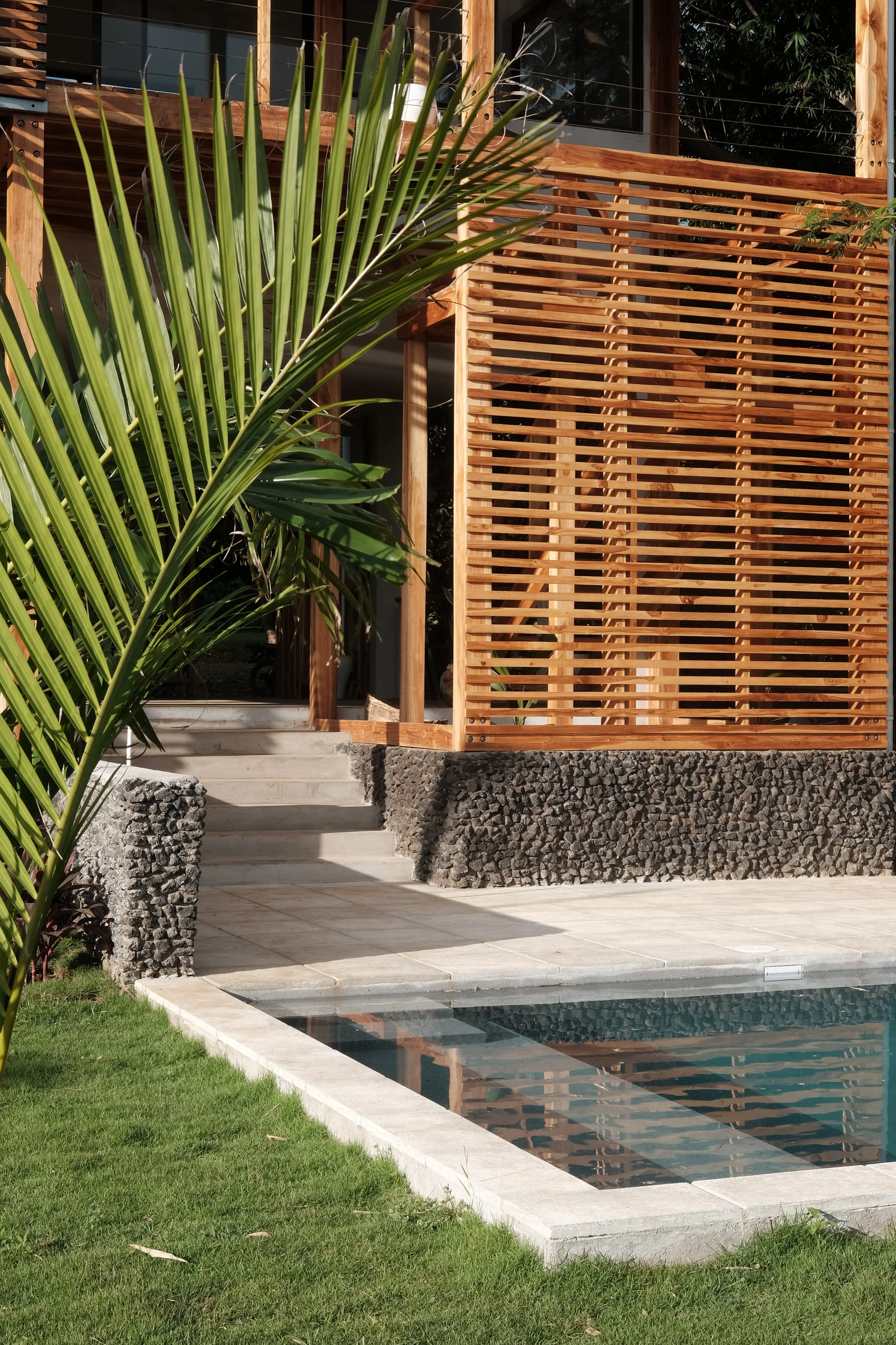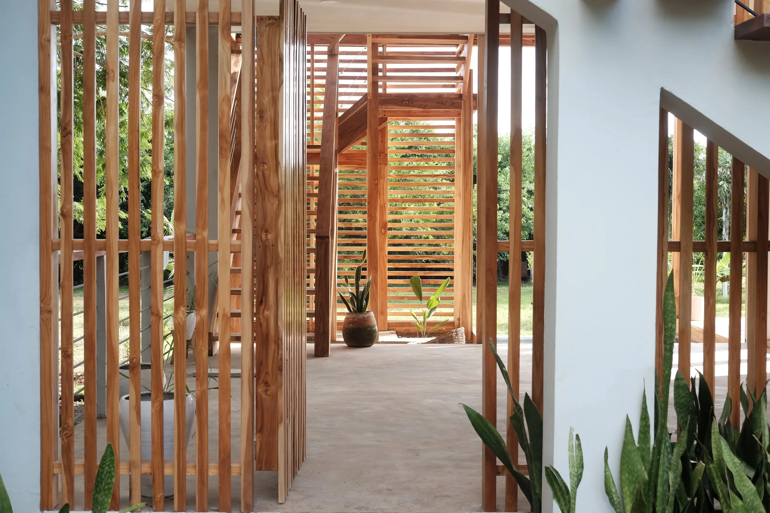 The redesigned residence at Boom Beach features significant alterations and additions aimed at improving sun management and enhancing livability. Originally facing west, the house was exposed to the intense afternoon sun, which increased indoor temperatures. The new addition introduces an outdoor terrace and employs wooden slats to provide shade and reduce solar exposure. These slats serve a dual purpose: offering privacy and creating a play of light and shadow that evokes the dappled effect of a tropical canopy. This design not only moderates heat but also imbues the interior with a refreshed, airy ambiance, seamlessly blending with the natural beachfront setting.